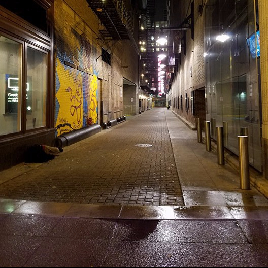 At the entrance was a man, whom I presumed to be homeless, sitting upon his pile of limited possession, asleep. The scene of it held my attention and seemed perfect for my alleyway project, so I took a picture before continuing on. This was a Thursday night into early Friday morning.